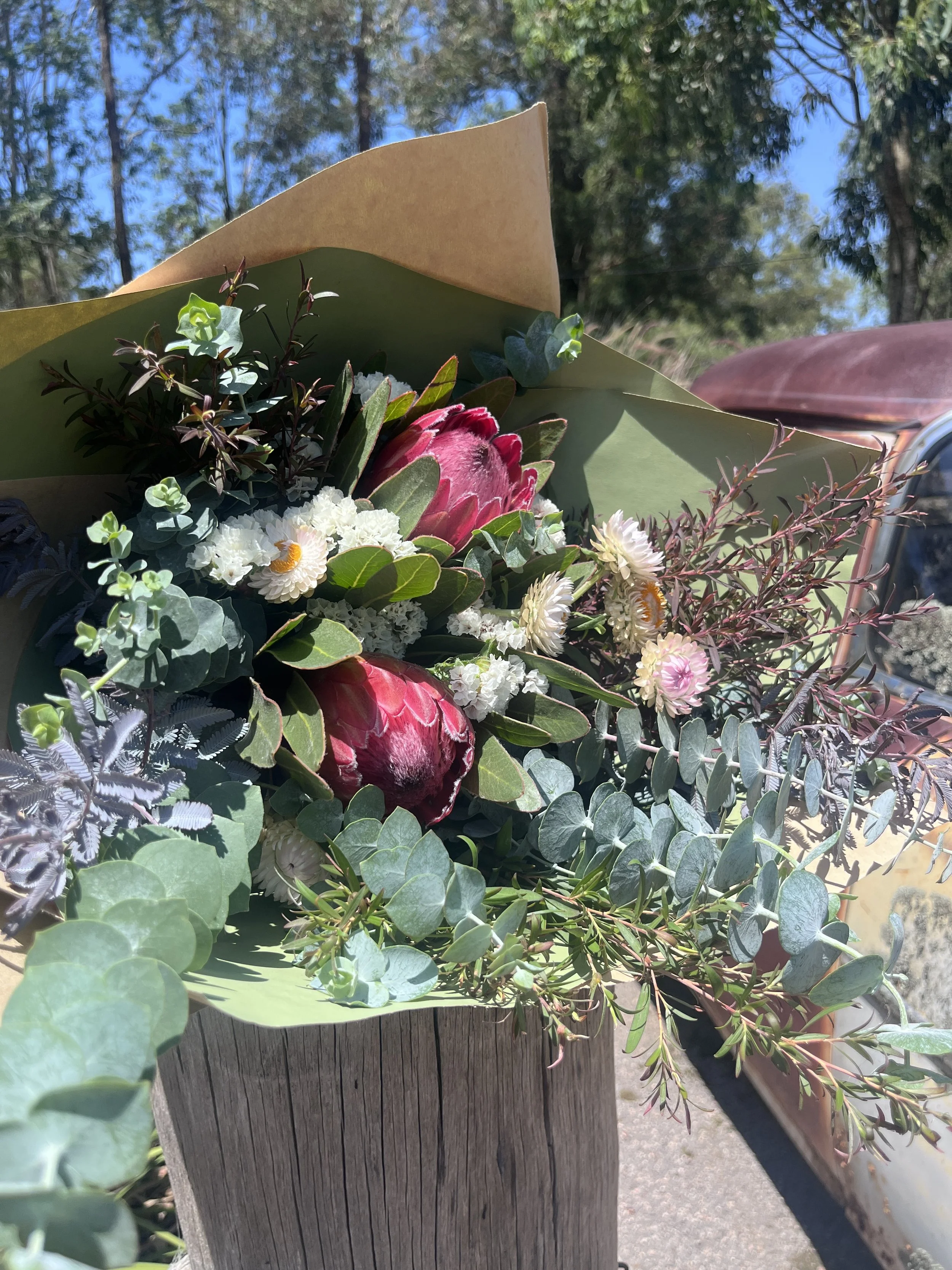We use locally grown and sourced native Australian and South African flowers, that vary with seasons. Our Valentine’s day arrangements feature protea as our hero focal flowers, complimented by a blend of textural florals and lush foliage.